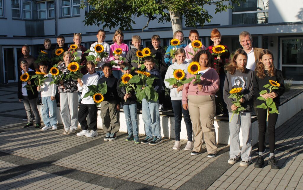 Als Unterstützung stehen Tutoren aus der 9. Klasse bereit. Sie kamen mit Sonnenblumen und übernehmen in den ersten Tagen und Wochen die Aufsicht für die Kleinen. Die Tutoren stehen den neuen Fünftklässlern mit Rat und Tat zur Seite und helfen, sich in der Schule zurechtzufinden.