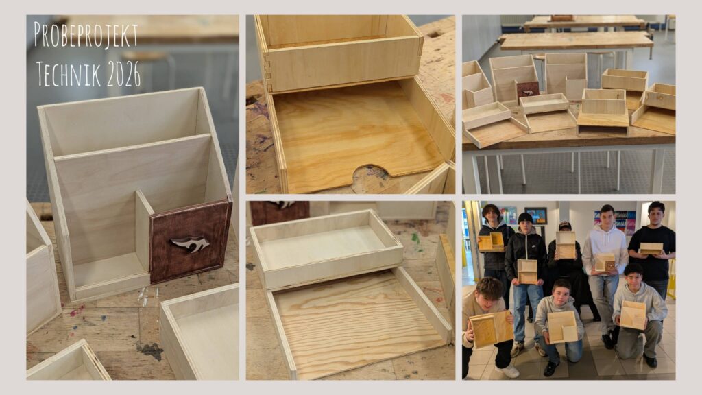 Zu Beginn des Schuljahres hat die 8. und 9. Klasse im Technikunterricht Schreibtischsets hergestellt. Diese wurden selbstständig von den Schülern in Gruppen geplant und gebaut.